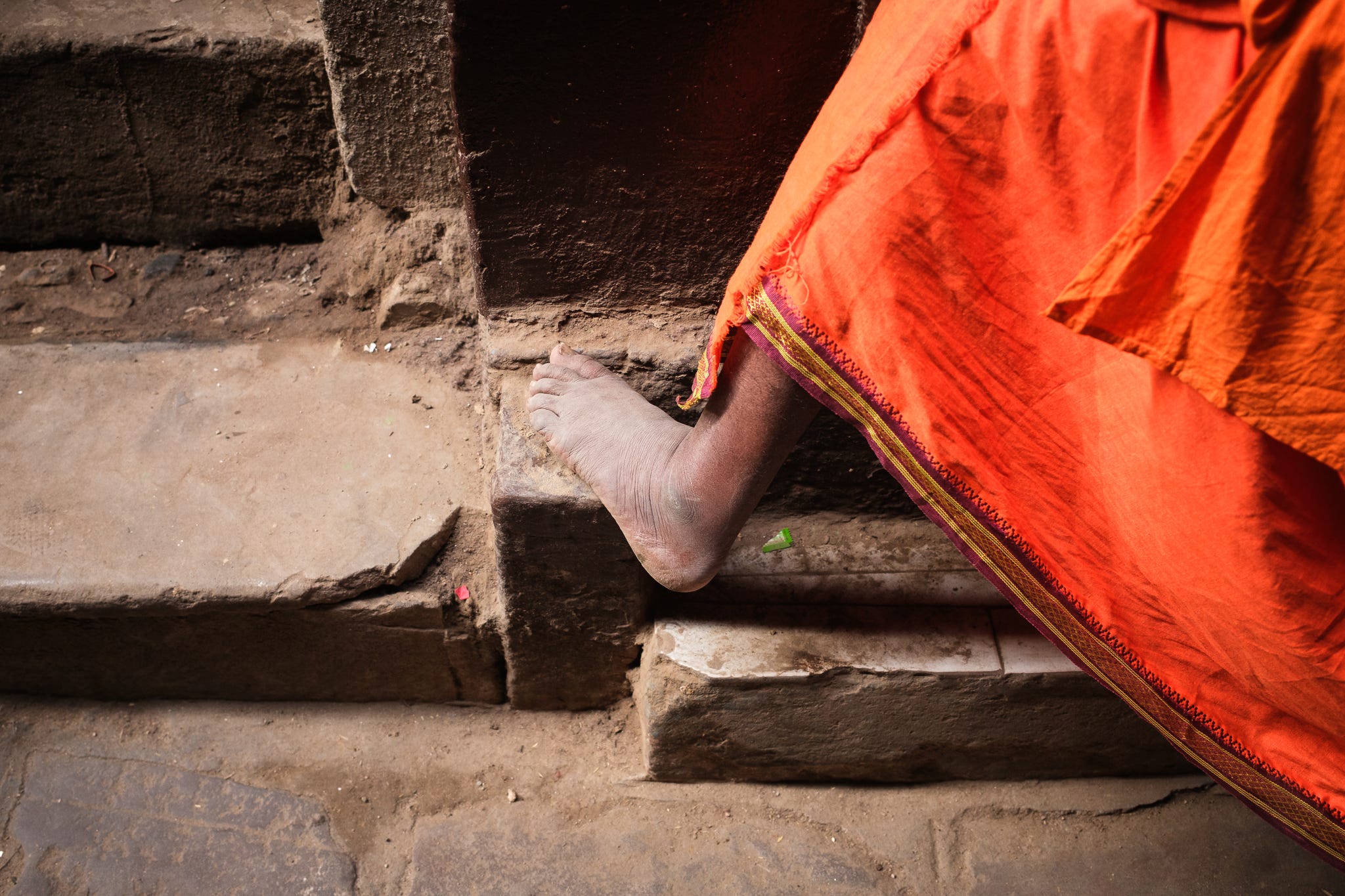 Walking barefoot in places of worship is seen as a way to stay grounded and humble before the divine, and most of the area in and on the ghats is, in some way or another, a place of worship. In Hinduism and Jainism, going barefoot is a form of penance and devotion, often done during pilgrimages which is the main reason so many people are actually in the city in the first place.